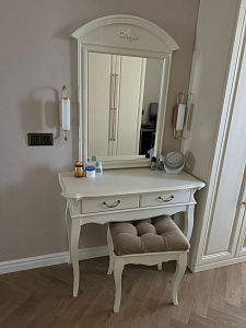 Три зеркальные створки позволяют разглядеть отражение под разными углами, а выдвижные ящики в основании — удобное место для хранения украшений и косметики. Основа выполнена из массива бука и МДФ, а внутренние части — из берёзовой фанеры. Все материалы тщательно отобраны, чтобы сохранить прочность и внешний вид на долгие годы.