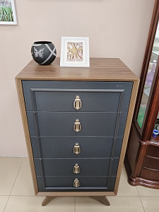Стул серии Алегро выполнен из экокожи цвета антрацита с вертикальной простежкой задней стороны спинки, ножки цвета грецкий орех в цвет другой мебели этой серии.