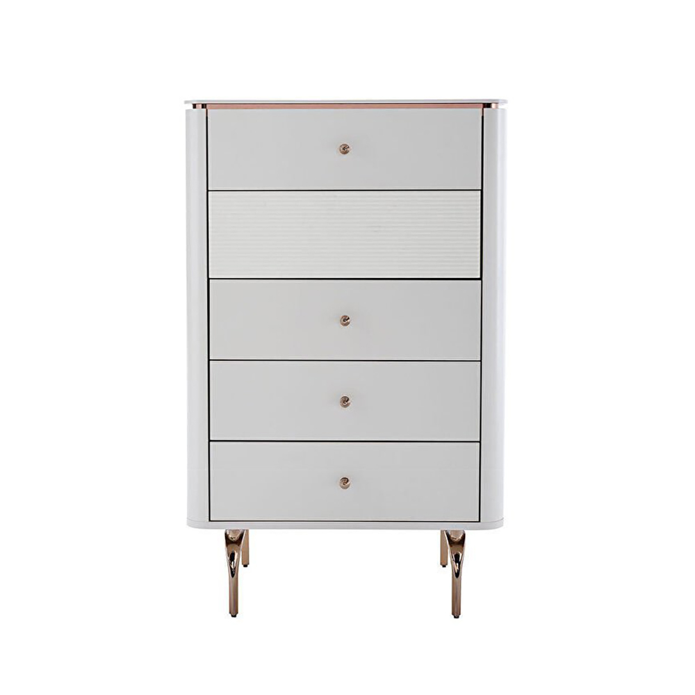 Высокий комод на изящных металлических ножках Larissa укомплектован ящиками.