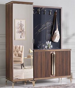 Шкаф платяной 5-дверный серии Montego изготовлен из высококачественного ЛДСП производства Турция, класс эмиссии формальдегидов Е1. Зеркальная дверь с рисунком- по центру, боковые отделения - распашные двери с со скругленной прямоугольной ручкой бронзового цвета и по два ящика. Шкаф стоит на металлических внешних ножках и дополнительный внутренних. Наполнение шкафа – три отделения: - узкое по центру- полки. - левое - штанга для вешалок сверху, полка и выдвижная вешалка для поясов, галстуков и прочих аксессуаров, правое - полка и штанга сверху. Двери и ящики с доводчиками, обеспечивающими плавный ход и безопасность.