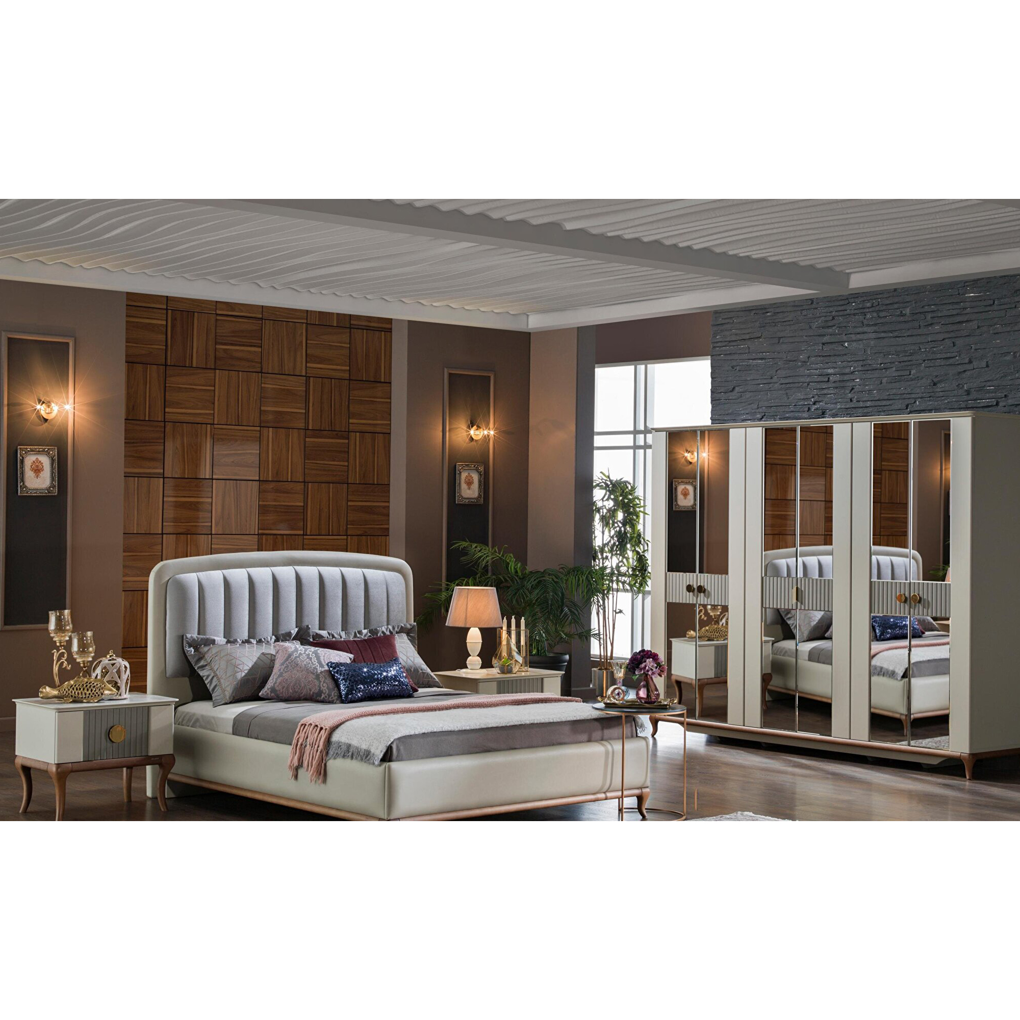 Шкаф платяной 6-дверный серии Pesaro Bellona. Изготовлен из высококачественного ЛДСП производства Турция, класс эмиссии формальдегидов Е1. Зеркальная дверь в центре с прямоугольной ручкой, двери справа и слева со вставками серого цвета и большими круглыми ручками под бронзу. Ножки и рамка из натурального дерева с оттенком медовый орех. Размеры и наполнение шкафа позволит аккуратно разместить большое количество вещей. Двери и ящики с доводчиками, обеспечивающими плавный ход и безопасность.