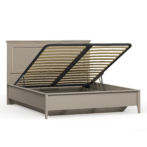 Двуспальная кровать оснащена подъёмным механизмом, который предоставляет доступ к вместительной ниши для хранения постельных принадлежностей.