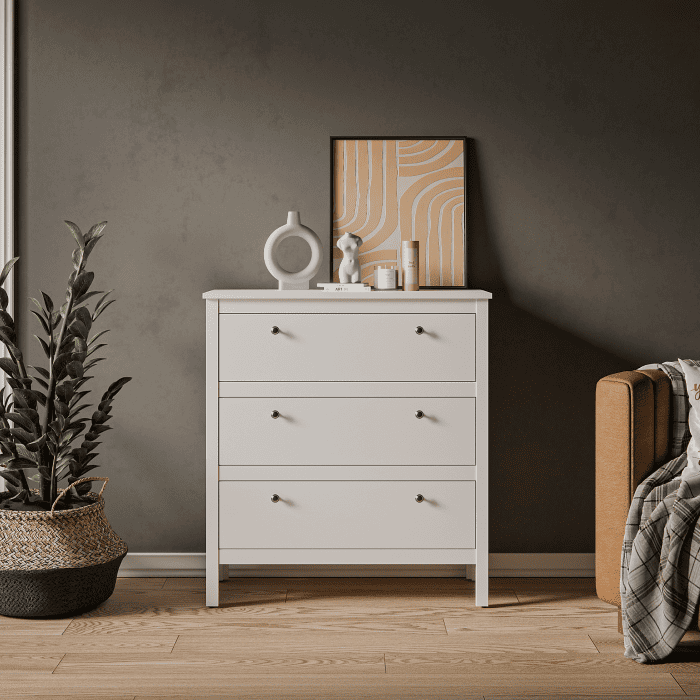 Три вместительных выдвижных ящика дополнены круглыми металлическими ручками. Высокие ножки делают мебель визуально лёгкой и воздушной, а также заметно упрощают уборку под ней.