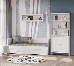 За распашными дверцами скрыто две просторные ниши для хранения одежды, аксессуаров, книг или игрушек. Открытая полка предоставляет дополнительное пространство для размещения различных мелочей.