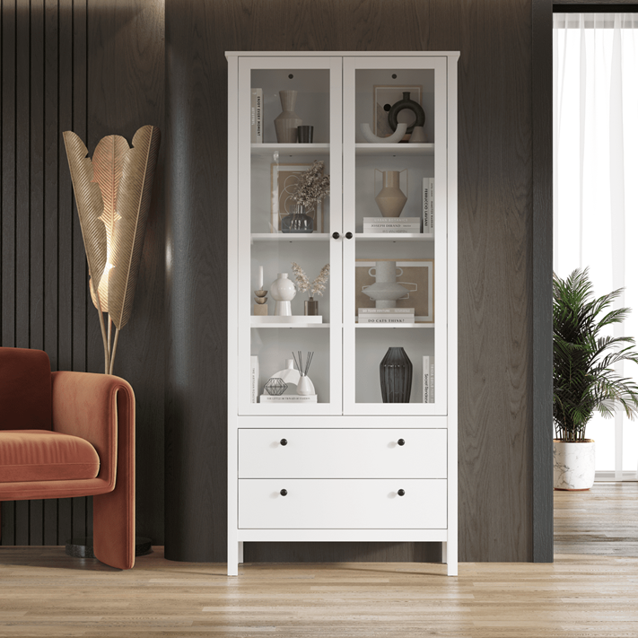 Витрина имеет две стеклянные дверцы, которые удобно предоставляют доступ к просторным полкам. Внутри вы можете хранить посуду, фарфор, книги, декоративные элементы или предметы коллекций. Два выдвижных ящика обеспечивают дополнительное место для хранения столовых приборов, скатертей, салфеток или других мелочей, которые всегда будут под рукой. Стильные металлические ручки придают витрине современный вид и обеспечивают комфортное использование. Высокие ножки гарантируют стабильное расположение на полу и облегчают уборку.