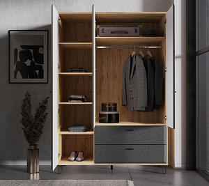 Комбинированный шкаф имеет удобную конструкцию. Сочетание полок разных размеров, выдвижных ящиков и открытой ниши делает эту мебельную единицу неотъемлемой частью любой комнаты.