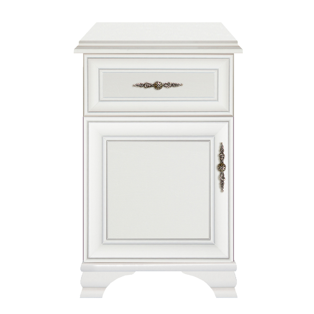 Компактные размеры тумбы позволяют легко разместить ее в небольших помещениях. Декоративные накладки на ручках добавляют изысканности и подчеркивают классический стиль. Фигурные ножки из МДФ обеспечивают устойчивое расположение на полу.