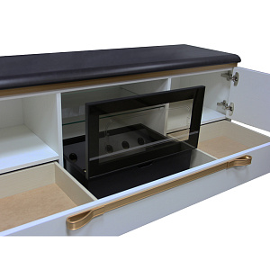 Великолепная мебель для богатой комнаты. Тумба известной фирмы доступна на заказ с доставкой во все уголки России. Белый экземпляр смотрится празднично, нарядно и хорошо гармонирует с мебелью «в тон». |