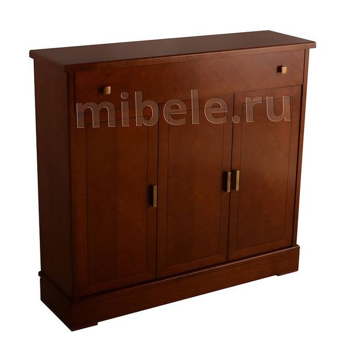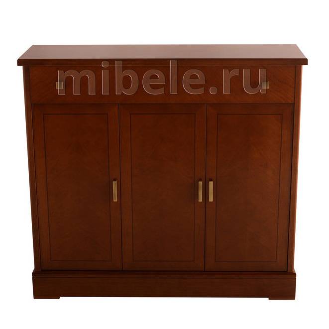 Комод благодаря наличию множества отделений для хранения, подойдет всем тем, кто ценит оригинальность и комфорт в интерьерных решениях. Модель выполнена из мебельной плиты (бук) и облицована шпоном черешневого дерева. Комод имеет три распашных отделения разного размера (боковые отделения укомплектованы двумя полками), а также ящичек для хранения мелочей. Створки декорированы фурнитурой бронзового цвета.