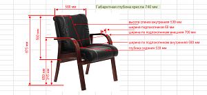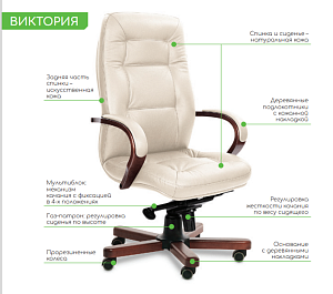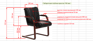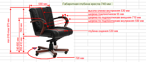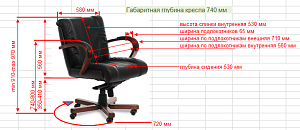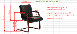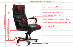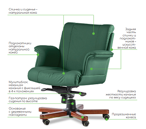 Чехол кресла выполнен из черной или цветной мебельной, натуральной кожи сквозного крашения со среднезернистым тиснением из цельных шкур крупного рогатого скота, задняя часть спинки по евростандарту из кожзама (компаньона) в цвет кожи. Толщина шкуры в стандартной точке 0,9-1,1мм. Для придания объемности и правильной эргономики чехла кресла - применяется холофайбер (марка 400). Все указанные материалы экологичные и износостойкие. Спинка и сидение чехла имеют вертикальные прострочки в виде двух полос, образуя по бокам два невысоких валика, а подголовник напоминает подушку.