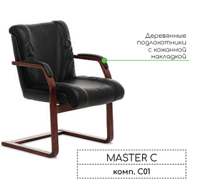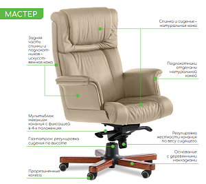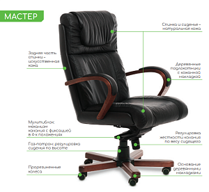 Кресло руководителя Master А - эксклюзивная модель из натуральной кожи премиум класса, выполняется с высокой спинкой и удобным подголовником, деревянными подлокотниками и деревянными накладками на крестовине, может быть выполнена в комплектации хром. Спинка и сидение уложены в фанерованный ковш, с внешней стороны обтянутый высококачественным кожзаменителем. Дизайн кресла сочетает в себе эргономичность и функциональность.