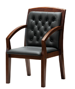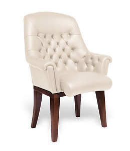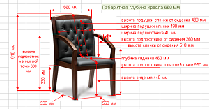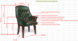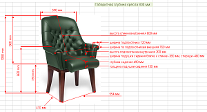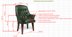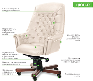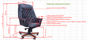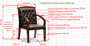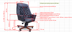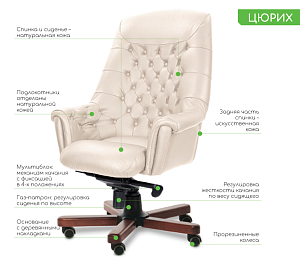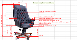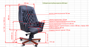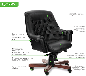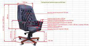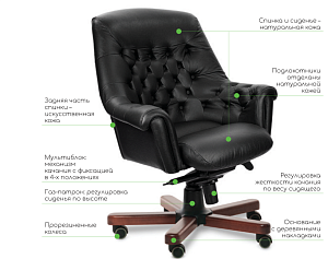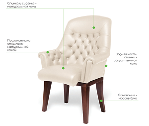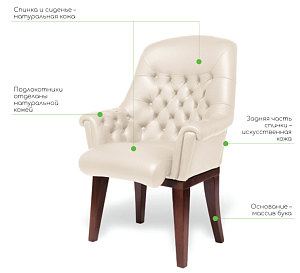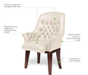 Чехол кресла выполнен из черной или цветной мебельной, натуральной кожи сквозного крашения со среднезернистым тиснением из цельных шкур крупного рогатого скота, задняя часть спинки по евростандарту из кожзама (компаньона) в цвет кожи. Толщина шкуры в стандартной точке 0,9-1,1мм. Чехол кресла с лицевой стороны на подлокотниках и спинке имеет утяжки в виде ромбов по всей поверхности. Утяжки выполнены с применением пуговиц, обтянутых экокожей. На сидении имеется одна поперечная прострочка. Все применяемые в изготовлении материалы экологичные и износостойкие.