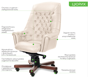 Кресло руководителя Zurich A - эксклюзивная и престижная модель в категории бизнес-премиум, отлично зарекомендовавшая себя в эксплуатации. Выполняется с высокой спинкой и деревянными накладками на крестовине. Спинка, плавно переходящая в подлокотники, образует чашеобразную эргономичную форму. Кресло изготовлено на едином сборном каркасе, отделано утяжками и пуговицами.