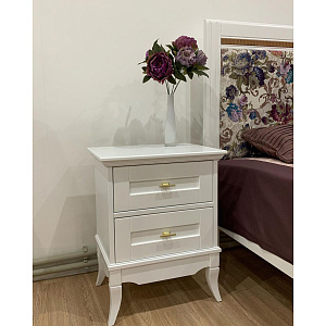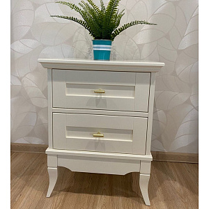 Фигурная модель на ножках в роскошном стиле классика с тремя вместительными выдвижными ящиками. Такая тумбочка из натурального массива подойдет для спальни любых размеров, поскольку не занимает много места. |