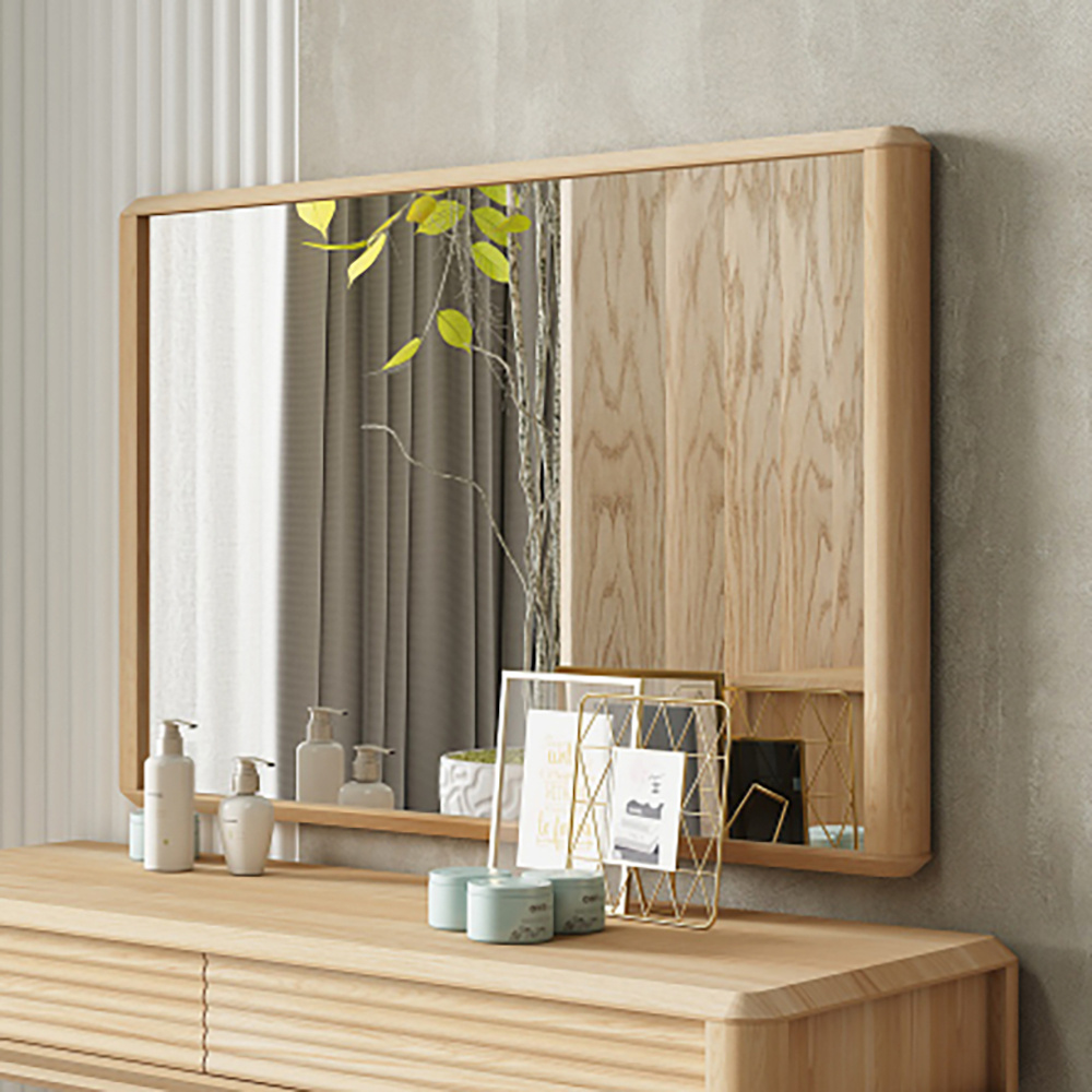 Каркас выполнен из массива дуба, фасад- массив дуба, полки- стекло. Задняя стенка-зеркало наклеенное на фанеру, облицованную шпоном дуба, дно ящиков-фанера, облицованная шпоном дуба. В ящиках -направляющие скрытого монтажа с доводчиком, дверь открывается нажатием-Push-To-Open, петли без доводчика.