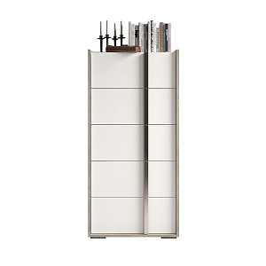 Витрина имеет двухцветное исполнение, сочетающее белый глянец с шероховатой текстурой светло-серого камня. Невысокие скошенные белые ножки придают визуальной лёгкости. В витрине стеклянные полки, блеск которых гармонично сочетается с блеском лакированных поверхностей, бесшумная фурнитура.