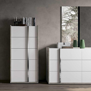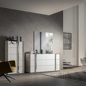 Мебель представлена в отделке белым глянцевым лаком с нанесением в несколько этапов, ламинате – имитация цемента, со стальными элементами в отделке полированный хром и зеркалами.