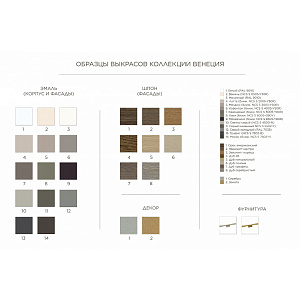 Также возможно изменение цветового решения по запросу: 16 видов эмали для корпуса, 6 видов шпона и 16 видов эмали для фасадов, 2 цвета декора (золото/серебро), ручки 2 цветов (золото/серебро).