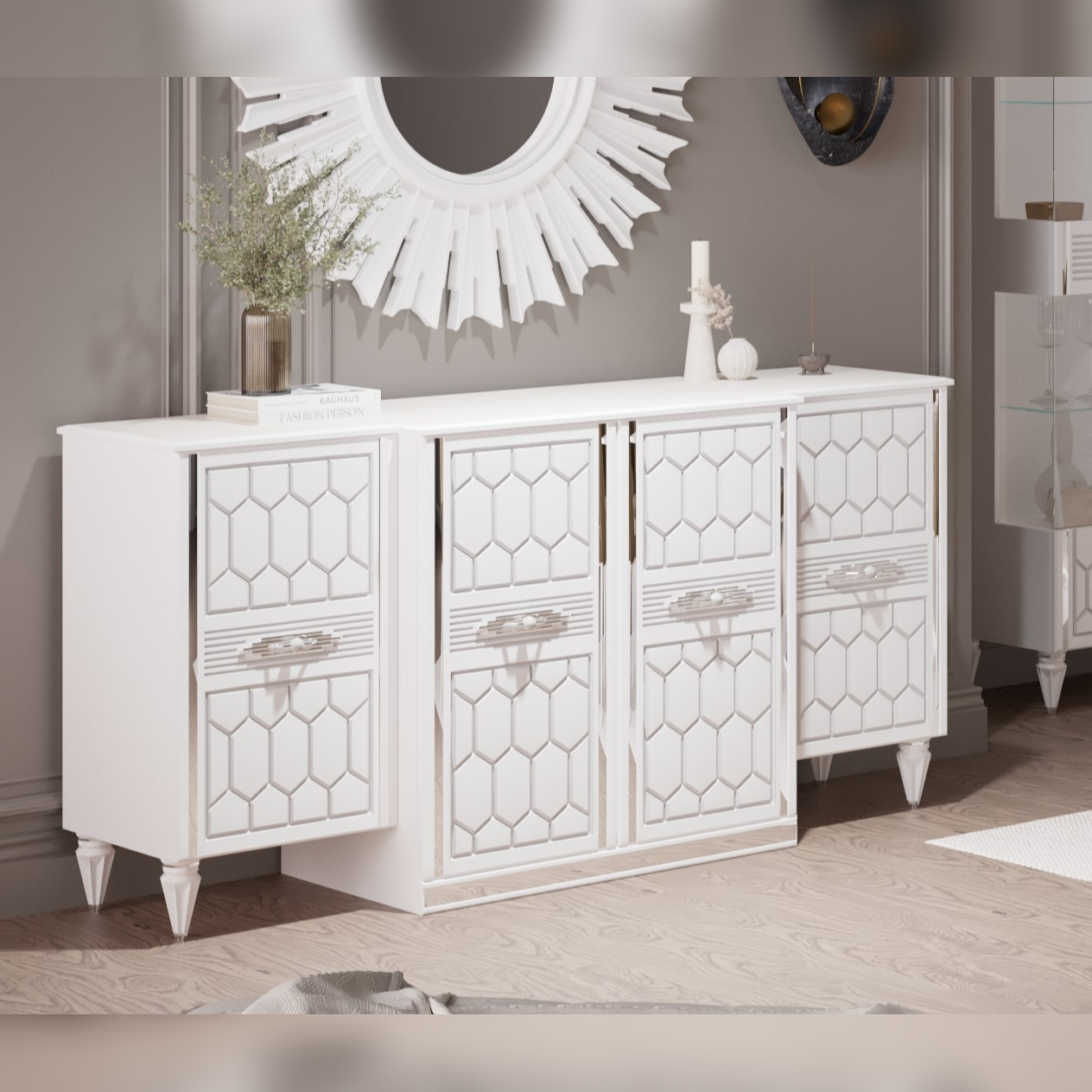 В просторной современной гостиной комод «Веллона Алено» легко становится центром уюта и практичности. Сдержанная белизна корпуса наполняет интерьер светом, а изысканные серебристые акценты подчеркивают элегантность и добавляют образу тонкой роскоши. В нем красота сочетается с удобством: четыре вместительных ящика бесшумно скользят по надежным металлическим направляющим, матовые фасады радуют приятной гладкостью, а прочная основа выдерживает нагрузку до 350 кг, обещая долгие годы службы.